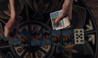 The day before we were meant to shoot the solitaire scene, the deck presented to me by our props team was lovely… but not right. I returned to my condo that evening and sorted through my collection of card decks (which of course I had packed for the shoot… why???) and settled on one with bright orange marigolds. I’m so happy they ended up in the film.”