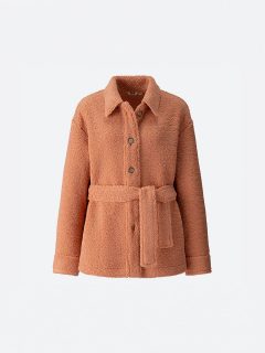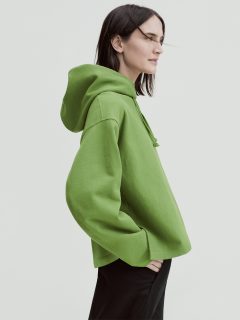 Cotton oversized fit striped long-sleeved shirt, €39.90. Pile lined fleece short coat in pink, €49.90. Padded short parka, €109.90. Wool blend flared trousers in grey, €59.90. Sweat long-sleeved pullover hoodie in green, €29.90. Uniqlo U is available online and in selected stores.