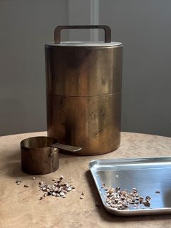 The tea caddy is the storage for my Mugicha Roasted Barley. I first tasted this infusion in Hakone in Japan, in accompaniment to some homemade Soba Noodles. It was a very rainy day and after a hike we took shelter in a small local shack by a bridge overlooking a river. I don’t believe that place had a menu, and only a few tables set on a terrace with a simple roof in bamboo. Sometimes the biggest luxury is relinquishing all control and allowing yourself to be taken care of. To this day I think it was one of the best meals of my life.