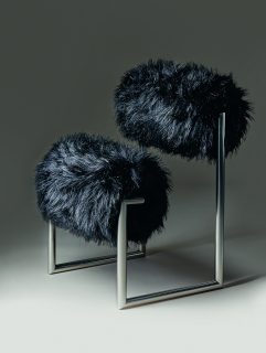 Working out of her own Milanese atelier from the 1950s, Nanda Vigo resolutely pursued a unique, science-fiction-inspired vision, as portrayed in the Due Più (‘two more’) Chair, her most recognizable furniture design. Devised especially for More Coffee, Milan, the frame is made from chromed tubular steel, generously upholstered in faux-fur wool, both materials part of Vigo’s signature repertoire. The juxtaposition combines a reference to the industrial functionality of the Bauhaus with a love of 1960s Pop Art. In 2015, the chair featured in a retrospective of Vigo’s work from the 1960s and 1970s, at SpazioFMG for Architecture, in her home city.