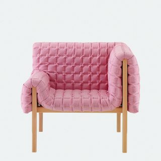 With this whimsical, asymmetrical armchair, Inga Sempé combines the tall uprights of its simple frame with an undulating duvet in a union of rigorous straight lines and welcoming curves, its compact form suitable for apartment living. With no hard edges under the padded cover draped over the top, its single arm, positioned either left or right, expands the positions that users can adopt. ‘Ruché’ refers to the sewing technique whereby fabric is gathered or pleated, reflected here in the quilted upholstery. The armchair’s solid-beech structure and feet are reinforced by two steel frames on the seat and back: comfort is provided by way of polyurethane foam cushions over Pullmaflex suspension on the seat and a sprung-steel grill for the back, covered with polyester quilting.