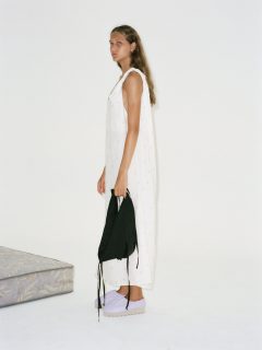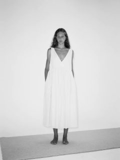 Founded by Juliette Harkness and Emma Nelson the current collection brings consists of oversized dresses with flattering and unexpected details like twisted straps, gathered sleeves or plunging necklines. The separates neatly express a love for wrapping, from modern wide trouser shapes to sculptural cardigans. The bedding compliments, in washed putty tones and timeless stripes, crafted from certified washed French linen that will continue to soften with wash and wear.