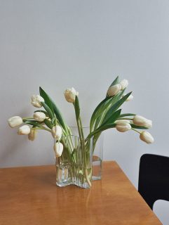 The heads will bend the stems as the flowers age, so leave them to drape around the curves of the vase, and let the petals fall. If you feel adventurous, use fewer tulips and lay them in one direction for a more asymmetric look.